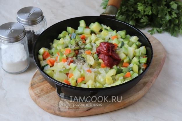 Перемешать и готовить 5 минут. По истечению времени кабачки должны полностью растаять, а в сковороде - появиться много жидкости.
