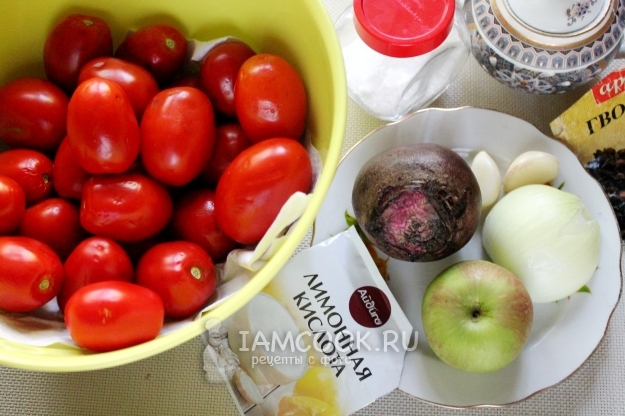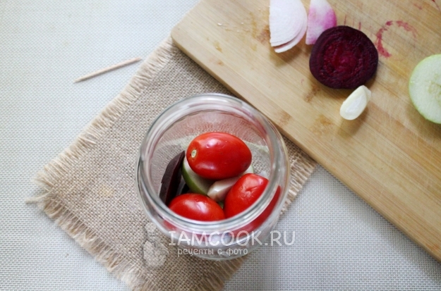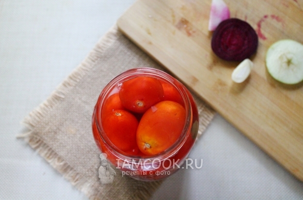 Для приготовления маринованных помидоров со свеклой и яблоками на зиму подойдут некрупные сорта засолочных помидоров, их удобнее укладывать в небольшие баночки, перекладывая кружочками свеклы, яблок и лука.