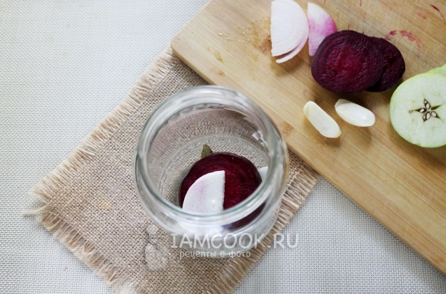 Заранее простерилизуйте баночки, прокипятите крышки. Начинайте укладку - сначала положите сухие пряности, потом кольца свеклы, лука.