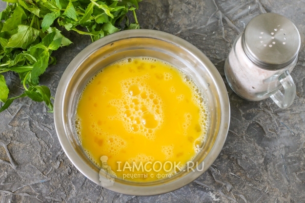 Разбейте куриные яйца в миску или емкость, всыпьте щепотку соли, сахар и взбейте венчиком примерно 2 минуты.