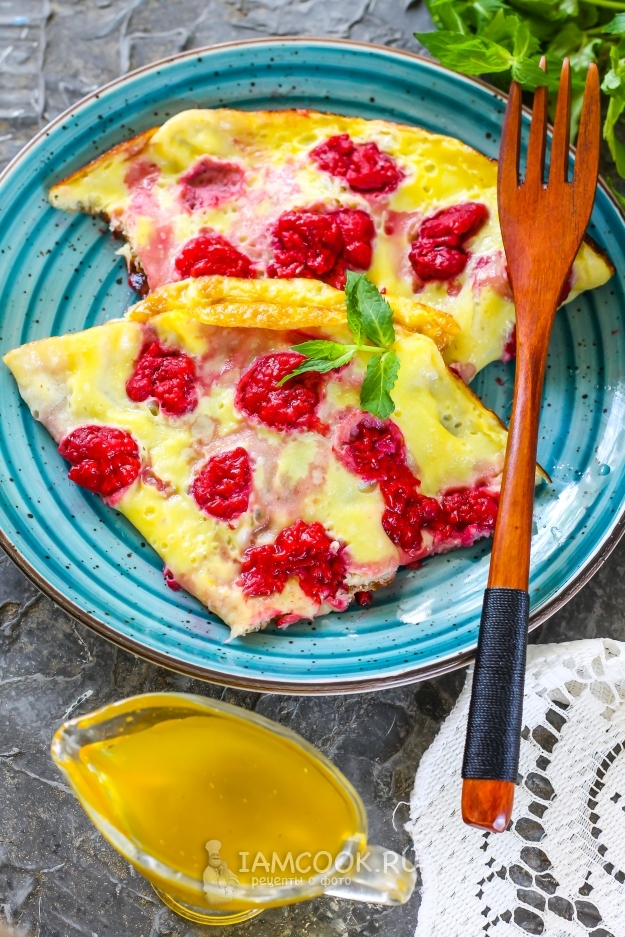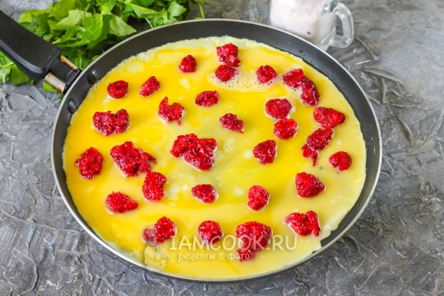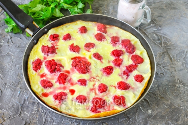 Готовый сладкий омлет с малиной выложите на тарелку и подайте к столу теплым.