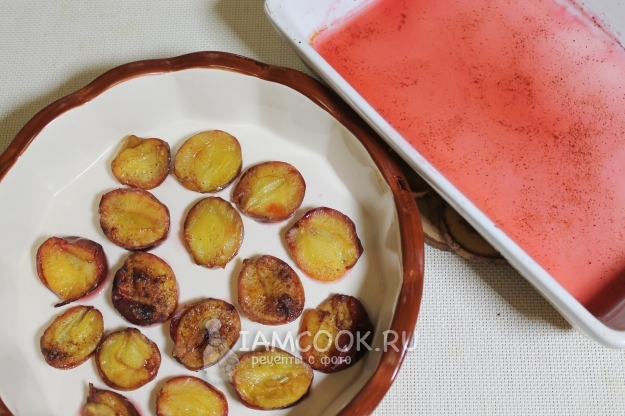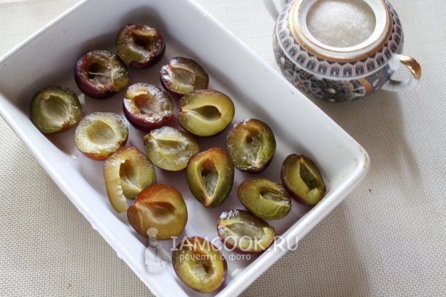 Из слив удалите косточки, разрезав плоды пополам. Выложите сливы слоем в формочку для запекания.