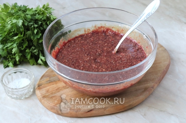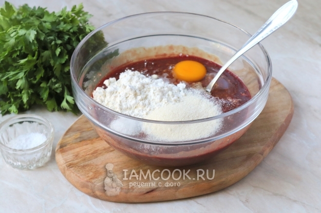 Вбить куриное яйцо, добавить муку, манную крупу и соль по вкусу.