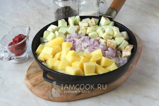 Тем временем очистите оставшиеся овощи. Лук нарежьте мелкими кубиками, картофель - средними. Баклажаны промойте чистой водой и вместе с луком и картошкой отправьте в сковороду. Перемешайте и готовьте ещё 5 минут.