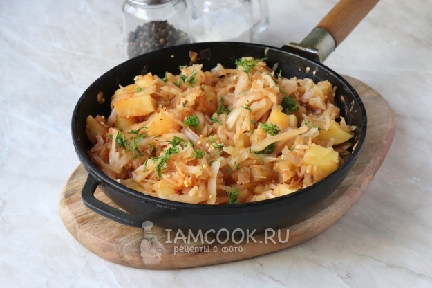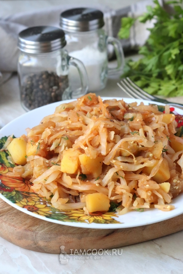 На стол тушеную капусту с картошкой и баклажанами подают в горячем виде как самостоятельное блюдо. Единственным дополнением может стать разве что кусочек белого хлебушка, и то по желанию.