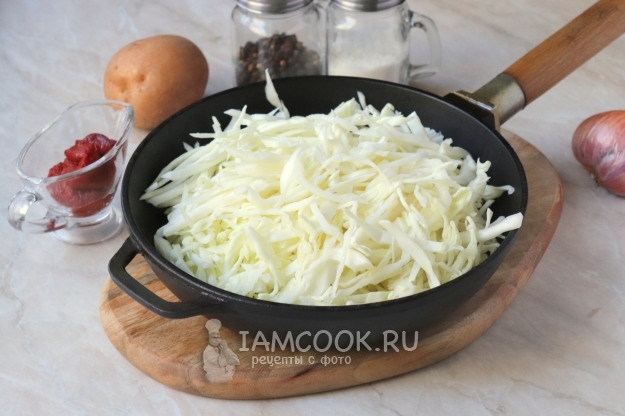 Нашинкуйте тонкими длинными полосами капусту и отправьте на сковороду, разогретую с растительным маслом. Готовьте помешивая 5 минут.