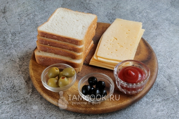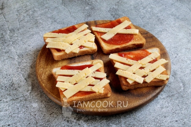 Рекомендую нарезной тостовый хлеб (все ломти одинаковой толщины, равномерно подсушиваются), сыр плавких сортов (имитирует забинтованных мумий) и соус/кетчуп на основе красных томатов (для кровожадности).