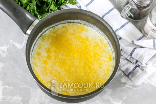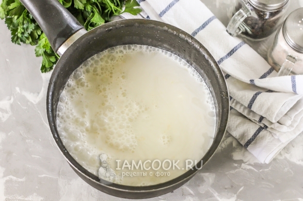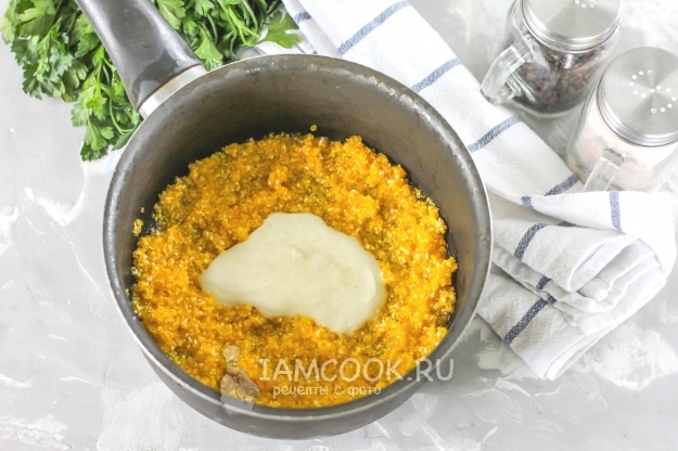 Пересыпьте ее в казан или ковш с антипригарным дном. Добавьте сметану любой жирности, соль и немного молотого черного перца для аромата.