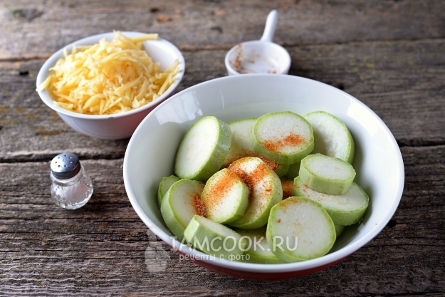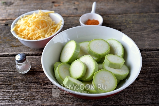 Кабачок нарежьте кружочками толщиной до 1 сантиметра, сложите в глубокую миску.