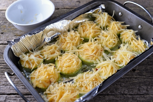 Каждый кружок присыпьте натертым твердым сыром. Отправьте кольца кабачков с сыром в духовку, предварительно разогретую до 200 градусов, на 15-20 минут. Запекайте в режиме верхнего и нижнего нагрева.