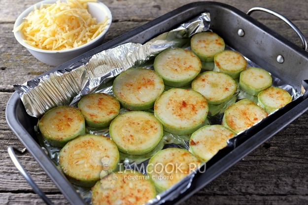 Форму для запекания выстелите фольгой, выложите ломтики приправленного кабачка в один слой.