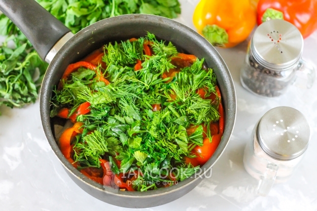 Спустя указанное время масса в емкости убавится вдвое, выделит сок. Промойте свежую зелень укропа и измельчите, добавьте в емкость. Очистите и нарежьте туда же зубчик чеснока. Тушите еще 10 минут. По желанию можете добавить кинзу, если дети любят такую ароматную зелень. Увы, моя дочь ее не любит!