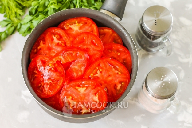Промойте помидоры и вырежьте сердцевинку. Нарежьте кружочками и выложите на слой лука. Лучше всего использовать розовые томаты - они более сладкие.