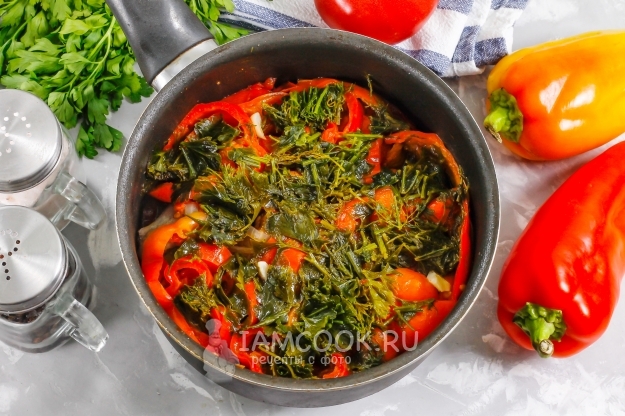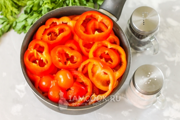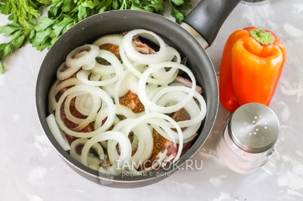 Последним слоем выложите болгарский перец, промытый, очищенный и нарезанный кружочками. Поместите емкость на плиту, включая максимальный нагрев на 5 минут, и накройте ее крышкой. Спустя 5 минут убавьте нагрев до минимального и тушите молодую баранину 2 часа, а более взрослую - 3 часа.