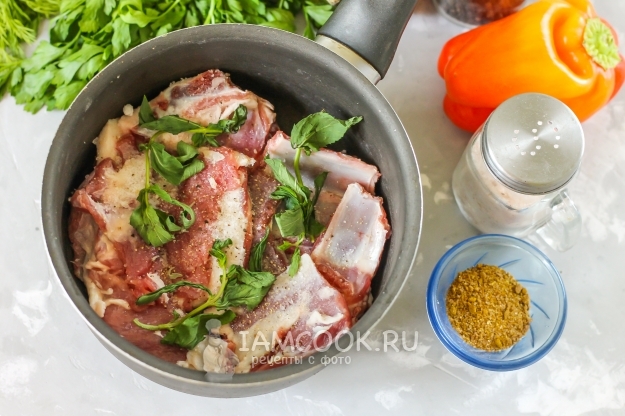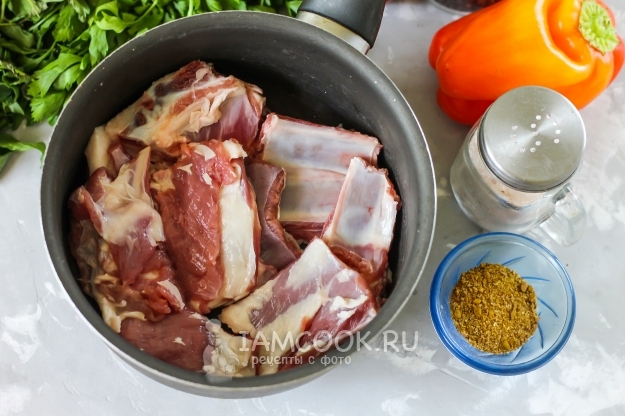 Баранину промойте в воде, очистите от пленок - увы, они в большом количестве присутствуют на таком мясе. Нарежьте порционными кусочками и выложите в казан или посуду с антипригарным дном.