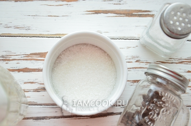 Через 15-20 минут воду слейте назад в кастрюлю. Добавьте соль и сахар, доведите рассол до кипения, помешивая. Проварите еще минуты 3, после чего влейте столовый 9% уксус, и это уже получится маринад. Снимите кастрюлю с огня.