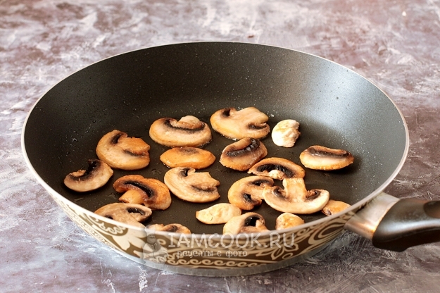 Шампиньоны нарежьте пластинками и обжарьте в небольшом количестве растительного масла. Слегка посолите и поперчите.