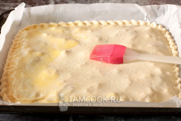 Накройте вторым пластом теста, которое также тонко раскатайте. Подравняйте нижний и верхний края теста, плотно защипните их и смажьте пиццу растопленным сливочным маслом. Оставьте немного масла напоследок. Выпекайте пиццу при самой высокой температуре вашей духовки, у меня это 250 градусов. Время примерное - 7-10 минут. Поверхность пиццы должна хорошо зарумяниться.