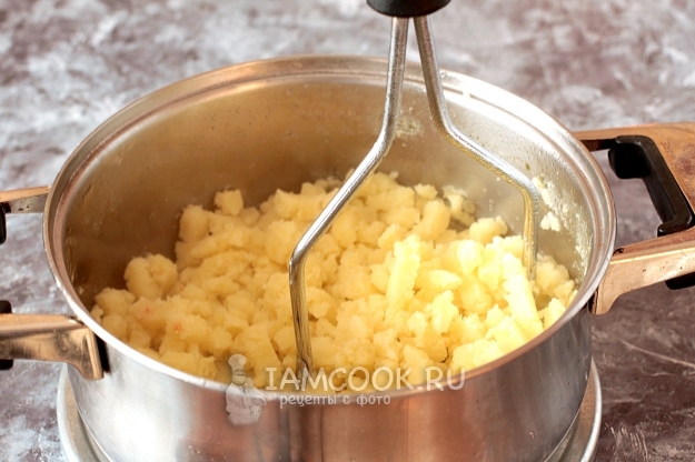 Отварите картофель в подсоленной воде, затем слейте всю воду полностью и разомните картофель в пюре.