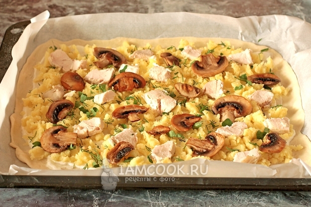 Удобно готовить такую пиццу, если с вечера осталась отварная картошка, а в холодильнике имеется кусок вареной курицы, например, из супа. Тогда процесс приготовления существенно упрощается.