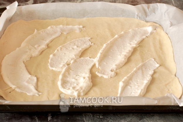 Я взяла половинную порцию дрожжевого теста для пиццы, которое замешивала сама по этому рецепту Тесто разделите на две части. Одну из них раскатайте очень тонко, до прозрачности, и выложите на противень, смазанный маслом. Если берете пергамент, то на всякий случай и его смажьте маслом. Размажьте по тесту подготовленную сметану с чесноком. Что касается формы, то, конечно же, лучше делать пиццу круглой, но у меня противень маленький и круг получился бы тоже небольшим. Я решила делать пиццу квадратной, чтобы получилось больше)).