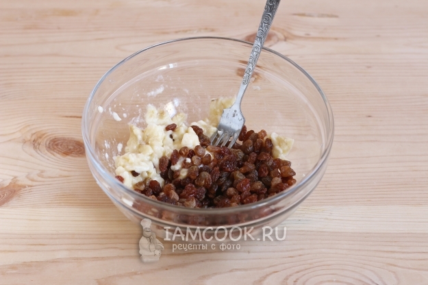 Бананы разминаем вилкой и кладем к ним отжатый от жидкости изюм.