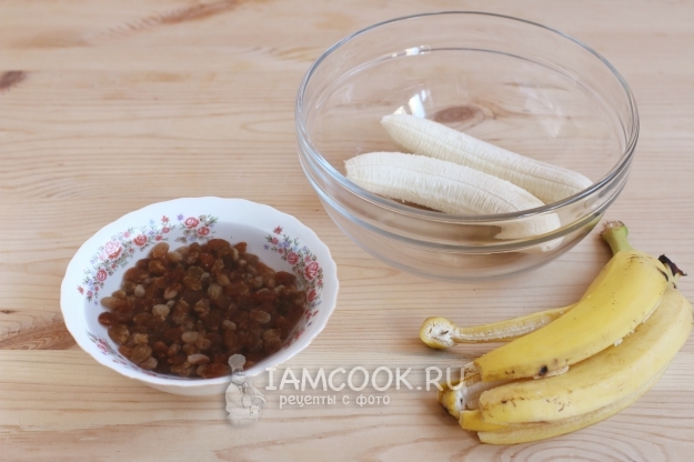 Бананы очищаем от кожуры и кладем в миску. Изюм промываем несколько раз в теплой воде, потом заливаем горячей водой и дадим постоять 5 минут, чтобы он немного размягчился.