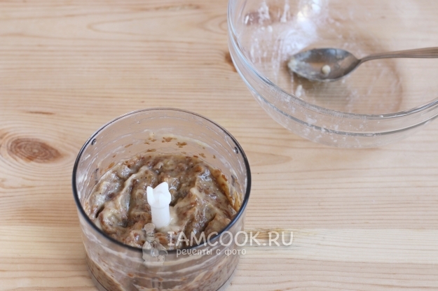 Теперь все это нужно измельчить в однородную массу. Можно это сделать в этой же миске погружным блендером. Что я и хотела сделать, но он у меня что-то начал выделываться и я переложила бананы с изюмом в измельчитель этого же блендера и измельчила в нем.