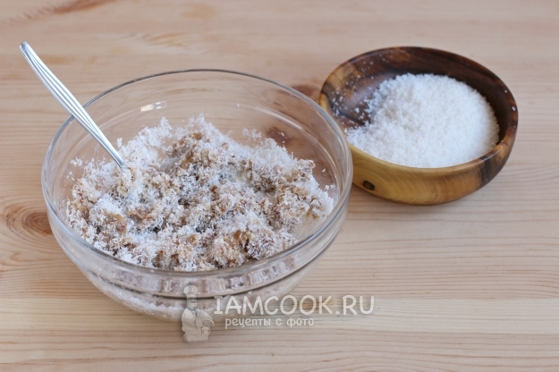 Выкладываем получившееся фруктовое пюре обратно в миску и всыпаем половину кокосовой стружки, перемешиваем.