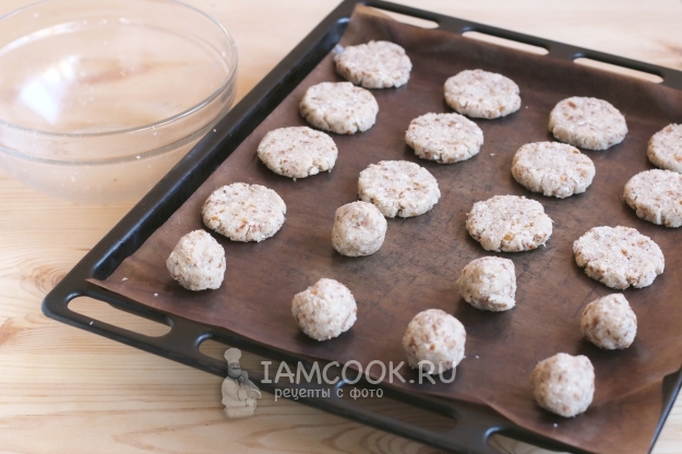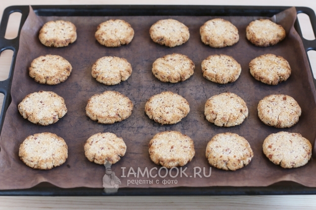 Из получившейся массы слепим одинакового размера шарики, потом каждый шарик расплющим в небольшую лепешечку и разложим на противне, застеленном пергаментом или антипригарным ковриком. Если используете пергамент, то смажьте его совсем немного растительным маслом. Отправляем противень с печеньями в разогретую до 170 градусов духовку и выпекаем примерно 15 минут. Но следите, чтобы печенье не подгорело, а лишь слегка зарумянилось.