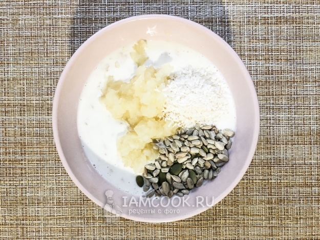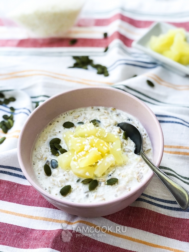 Если по утрам у вас нет времени на приготовления завтрака, то ленивая овсянка придет на помощь. Можно добавлять разные топпинги и изменять тем самым вкус. "Пина колада" известна всем - это сочетание ананаса и кокоса. Ананас я использовала консервированный, но со свежим будет еще вкуснее. Семечки можете заменить на орешки. В общем, не бойтесь экспериментировать.