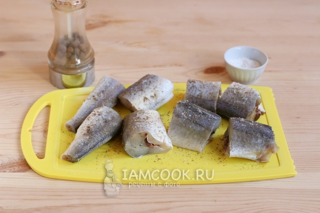 Затем посыпаем каждый кусочек солью и молотым перцем со всех сторон.