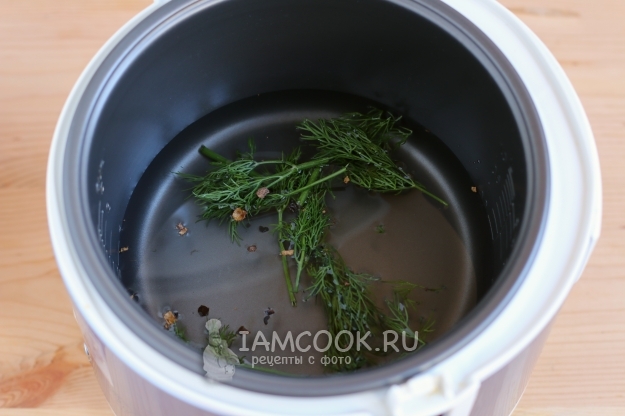 В чашу мультиварки (пароварки) или просто в кастрюлю, в зависимости от того, в чем вы будете готовить, наливаем воду, для аромата кладем веточки укропа и пару горошин душистого перца.