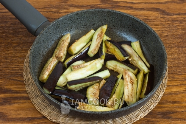 Добавьте на сковородку еще одну ложку масла. Разогрейте. Баклажаны промойте от соли и выделившегося сока, встряхните (можно высушить ломтики баклажанов полотенцем). Добавьте баклажаны на сковородку с горячим маслом. Обжаривайте, помешивая, до небольшого подрумянивания и затем переложите в миску к фасоли.