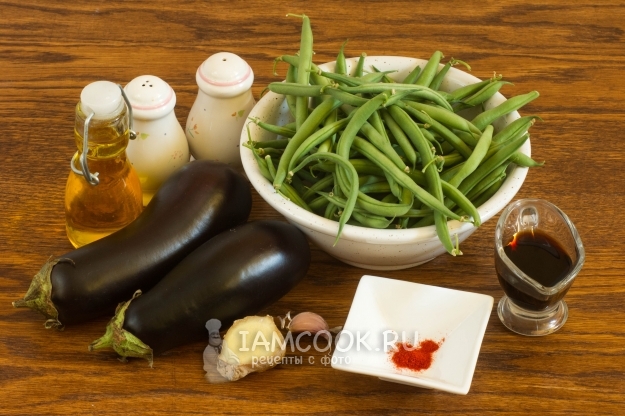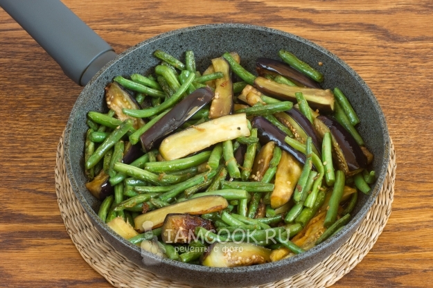 Добавьте в ароматное масло отложенные ранее баклажаны и фасоль. Посолите, влейте соевый соус, перемешайте. Тушите на малом огне 2-3 минуты.