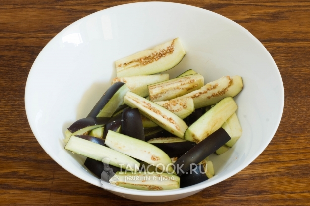 Баклажаны промойте, срежьте кончики и нарежьте сами баклажаны на брусочки небольшой длины. Посыпьте нарезанные баклажаны солью (2 ч.л.), перемешайте и отставьте в сторону на 15 минут.