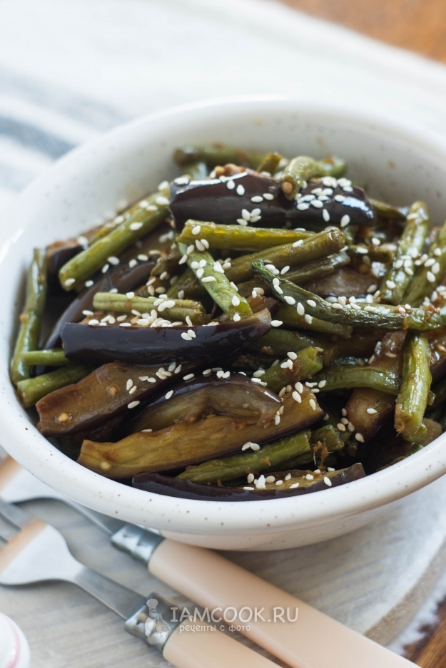 Блюдо готово к подаче! Украсим стручковую фасоль с баклажанами семенами белого или черного кунжута для усиления азиатского колорита!