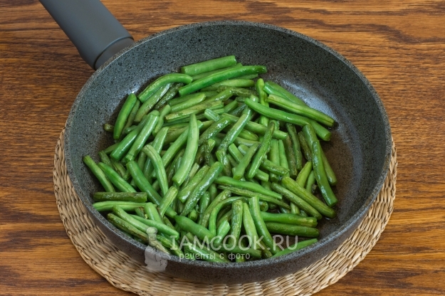 Тем временем промойте стручковую фасоль, срежьте кончики, особо длинные стручки фасоли разрежьте пополам. На сковородке разогрейте растительное масло, выложите подготовленную фасоль и обжаривайте, помешивая, до небольшого подрумянивания. Переложите обжаренную фасоль со сковородки в миску, стараясь оставить как можно больше масла на сковороде.