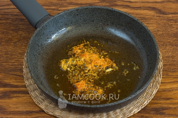 Опять добавьте 1 ст.л. растительного масла на сковородку, добавьте натертый на мелкой терке имбирь и чеснок, пряности. Обжарьте в течение 30-60 секунд.