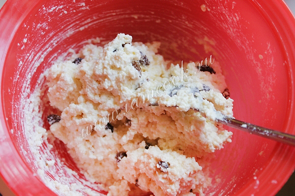 Творог надо растереть вилкой, добавить по вкусу сахар, желток и соль. Еще я добавила изюм, предварительно его запарив, но это по желанию. Если творог сильно сухой, добавим ложку сметаны.