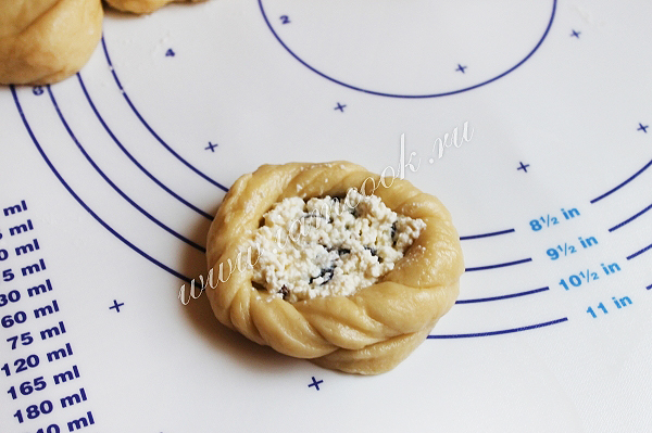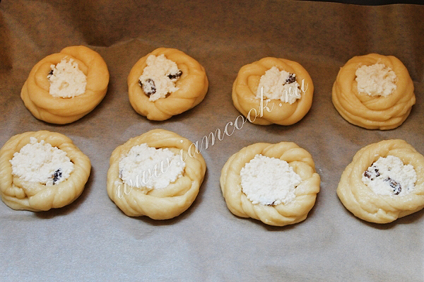 Затем выкладываем в ватрушки начинку. Дадим еще постоять и смазываем желтком.