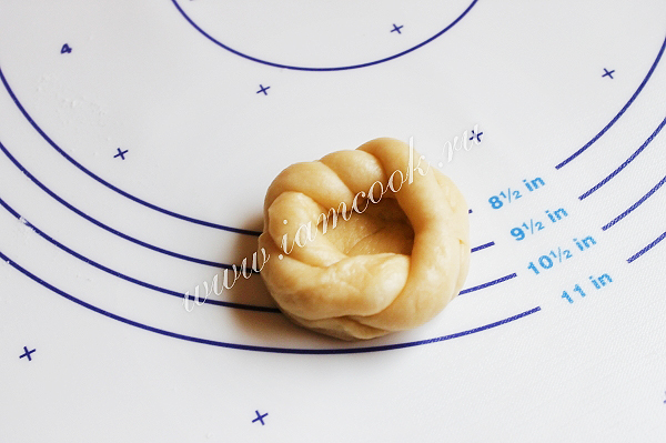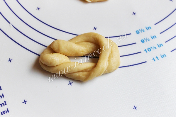 Получившеяся кольцо из теста растянем и накрутим на пальцы и слегка закрутим. Получится вот такое крученое колечко.