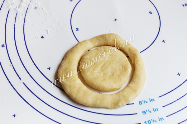 Теперь кладем это колечко на кружок, слегка прижимая. Вот такая получилась ватрушка. Можно сделать большего размера. Оставим ватрушки не надолго, минут на 15, для расстойки.