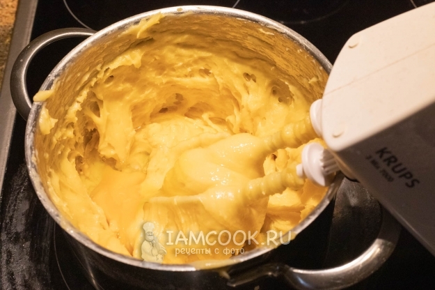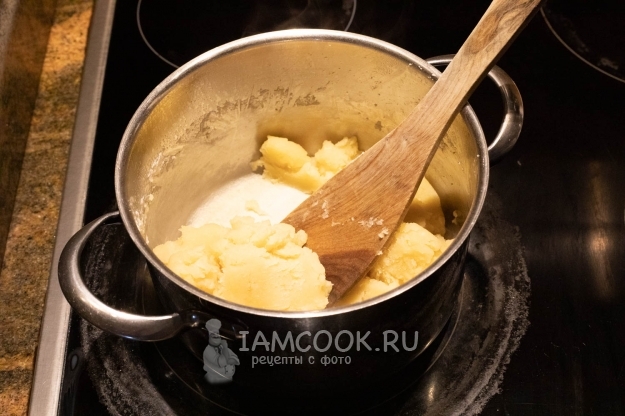 Когда молоко закипит, вмешиваем в него муку до получения кома эластичной однородной массы. Массу пару минут завариваем на слабом огне.