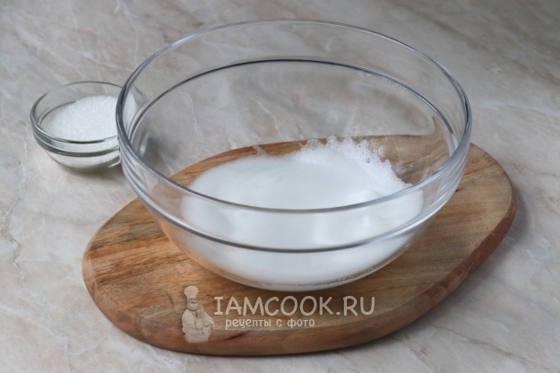Белок поместим в удобную для взбивания миску. Она должна быть идеально чистой и сухой, ЭТО ВАЖНО! С помощью миксера разобьем его структуру до образования лёгкой пены.