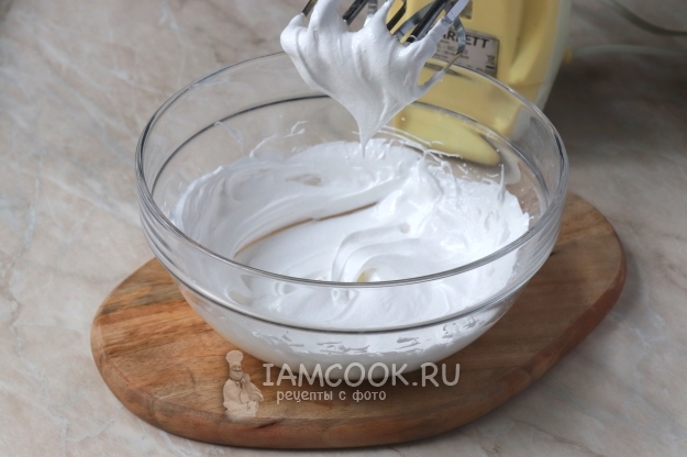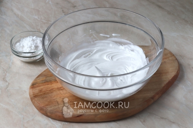 Добавим сахарную пудру и взобьем массу до стойких пиков.