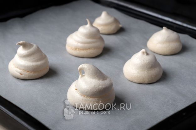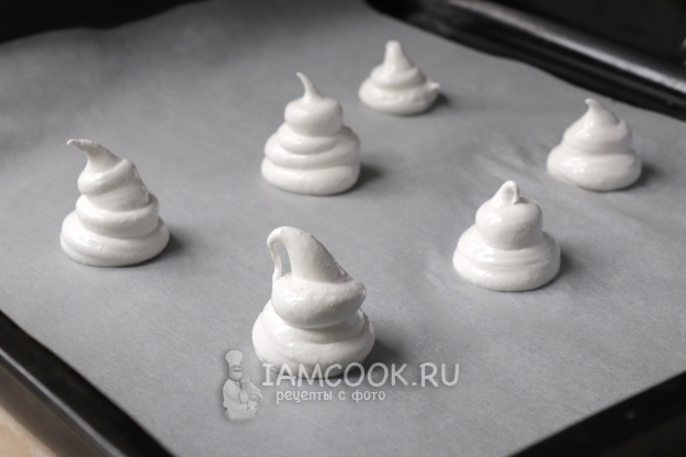 Противень застелем пергаментом и отсадим безе по типу высоких завитушек.