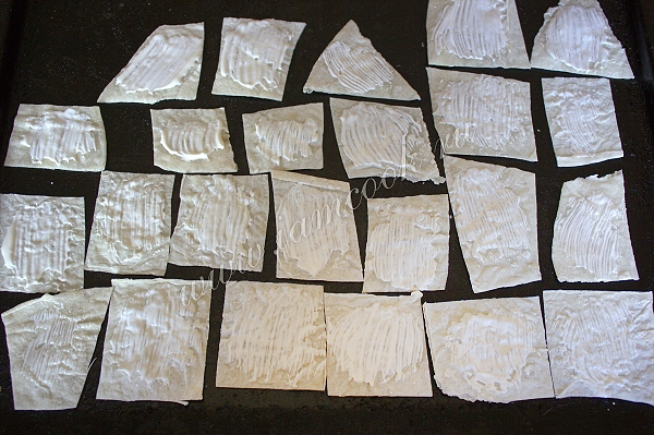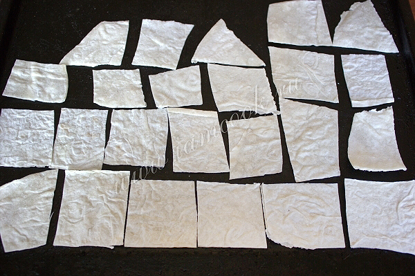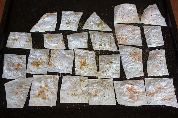 Лаваш нужно нарезать на кусочки. Удобно это сделать просто ножницами. Затем на сухой противень без масла разложите кусочки лаваша в один слой.