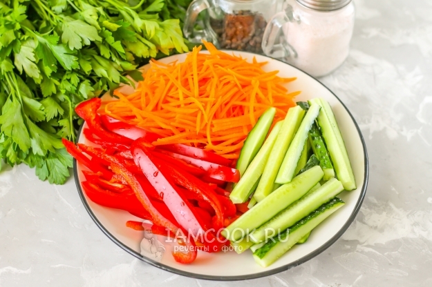 Очистите морковь от кожуры, промойте в воде. Натрите на терке для моркови по-корейски. Перец очистите от семян, срезав крышечки, промойте и нарежьте лентами. Огурцы тщательно промойте, срежьте хвостики и нарежьте брусочками.