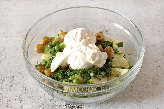 Огуречный салат с оливками и сметаной подайте к мясным или рыбным блюдам, к любым гарнирам и как самостоятельный легкий перекус. Приятного!